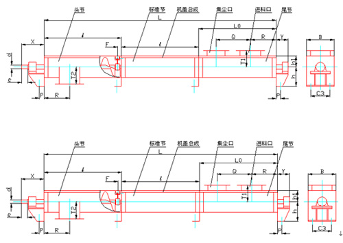 由于設計的螺旋輸送機的長度為12米。為了制造,安裝以及運輸?shù)姆奖?span>,其槽體和螺旋軸均采取分節(jié)制造,頭節(jié)長2.5米,接著是2.5米、2米、2.5米長的中間節(jié),尾節(jié)長2.5米,靠螺栓聯(lián)接,并用中間軸承支承。同時,為了_分節(jié)裝配后輸送機的整體剛度,槽體的連接處和螺旋軸的連接處需分開一段距離。由于物料在螺旋輸送機